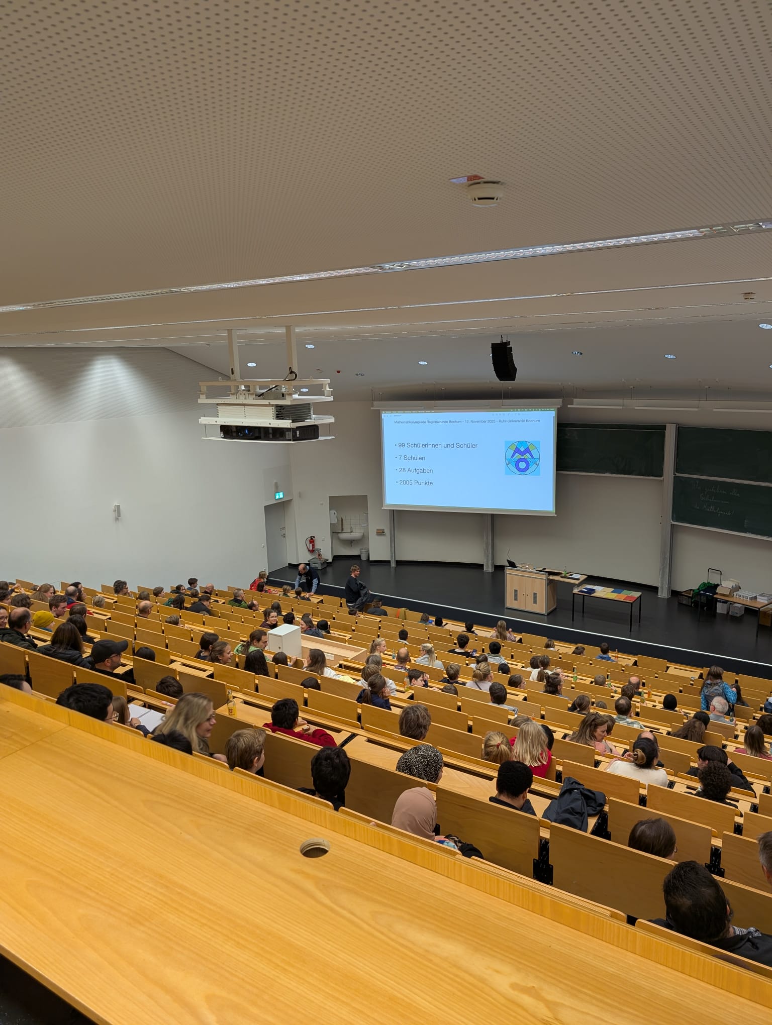 Am 12.11.2025 haben sich 23 Schülerinnen und Schüler anstatt auf den Weg ins Klassenzimmer auf den Weg zur Ruhr-Universität gemacht, um an der Regionalrunde der Mathematik-Olympiade teilzunehmen. Ihren Ehrgeiz hatten alle Schülerinnen und Schüler bereits in der vorhergegangenen ersten „Hausaufgaben-Runde“ bewiesen und diesen bei der dreistündigen Klausur an der Uni erneut gezeigt. Bearbeitet wurden in allen Klassenstufen jeweils 4 komplexe mathematische Fragestellungen.