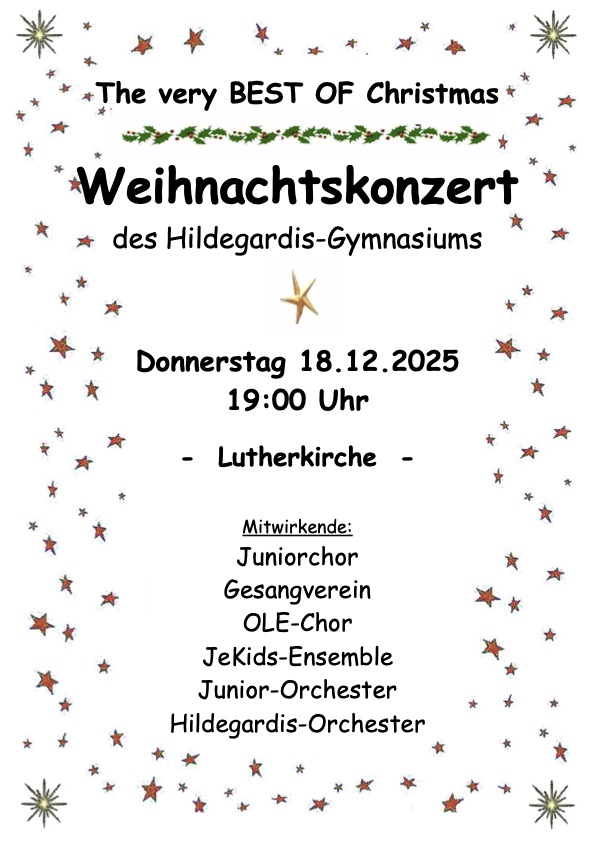 Am Donnerstag, dem 19.12.25, findet um 19h das große Weihnachtskonzert des Hildegardis-Gymnasiums in der Lutherkirche am Stadtpark statt. Es wirken die schulischen Instrumental-Ensembles „JeKids“, „Juniororchester“ und „Hildegardis-Orchester“ mit. Auch von der Internationalen Klasse kommt ein musikalischer Beitrag. In diesem Konzert liegt aber ein besonderer Schwerpunkt auf der Chormusik: Es wirken der „Juniorchor“, der „Gesangverein“ sowie der „OLE-Chor“ mit – der aus Oberstufenschülern, Lehrern und Eltern besteht und vor 16 Jahren von der Schülermutter Elisabeth Esch gegründet wurde. Sie wird in diesem Konzert verabschiedet, da ihre Kinder längst die Schule verlassen haben und ihr sogar schon ein Enkelkind geschenkt haben, mit dem sie nun mehr Zeit verbringen will.