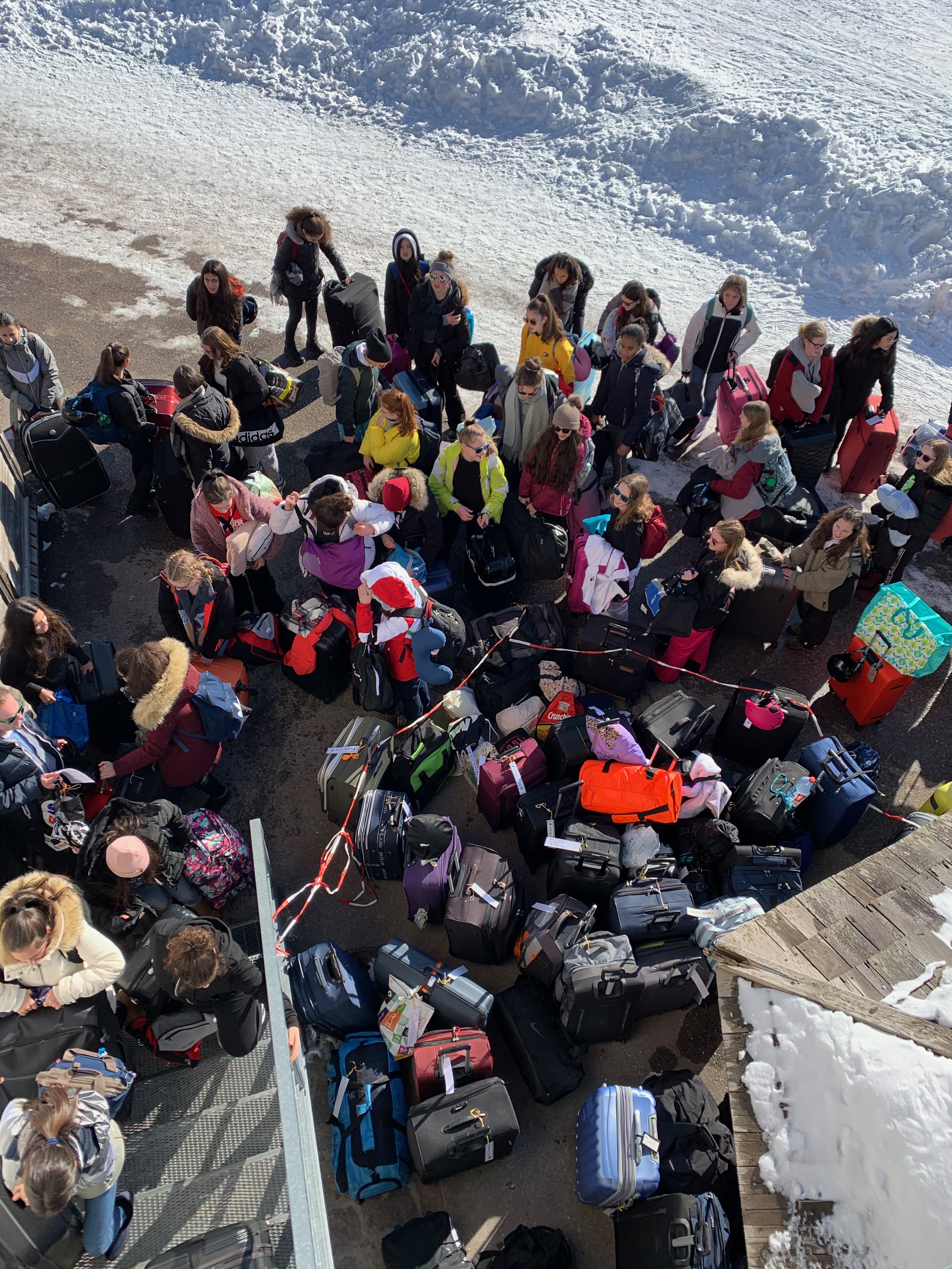 Ab 7:00 Uhr konnten wir dann unsere Koffer und Skitaschen über die Feuertreppen zum Bus bringen. Anschließend gab es ein letztes Mal Frühstück in Jochgrimm. Während des Beladens der Busse wurde deutlich wie kalt und windig es in Jochgrimm sein kann und wir waren alle sehr froh darüber, wie gut das Wetter während unserer Zeit in Jochgrimm war. Fast ausschließlich Sonne und kaum Wind! Während wir in der Kälte also gewartet haben, fingen einige von uns an zu singen. Vielleicht lag es am Gesang, aber dann fing es auch noch an zu schneien. Trotzdem fiel der Abschied von Jochgrimm schwer, aber die Zeit wird uns ganz sicher immer in Erinnerung bleiben. Bis bald Jochgrimm.