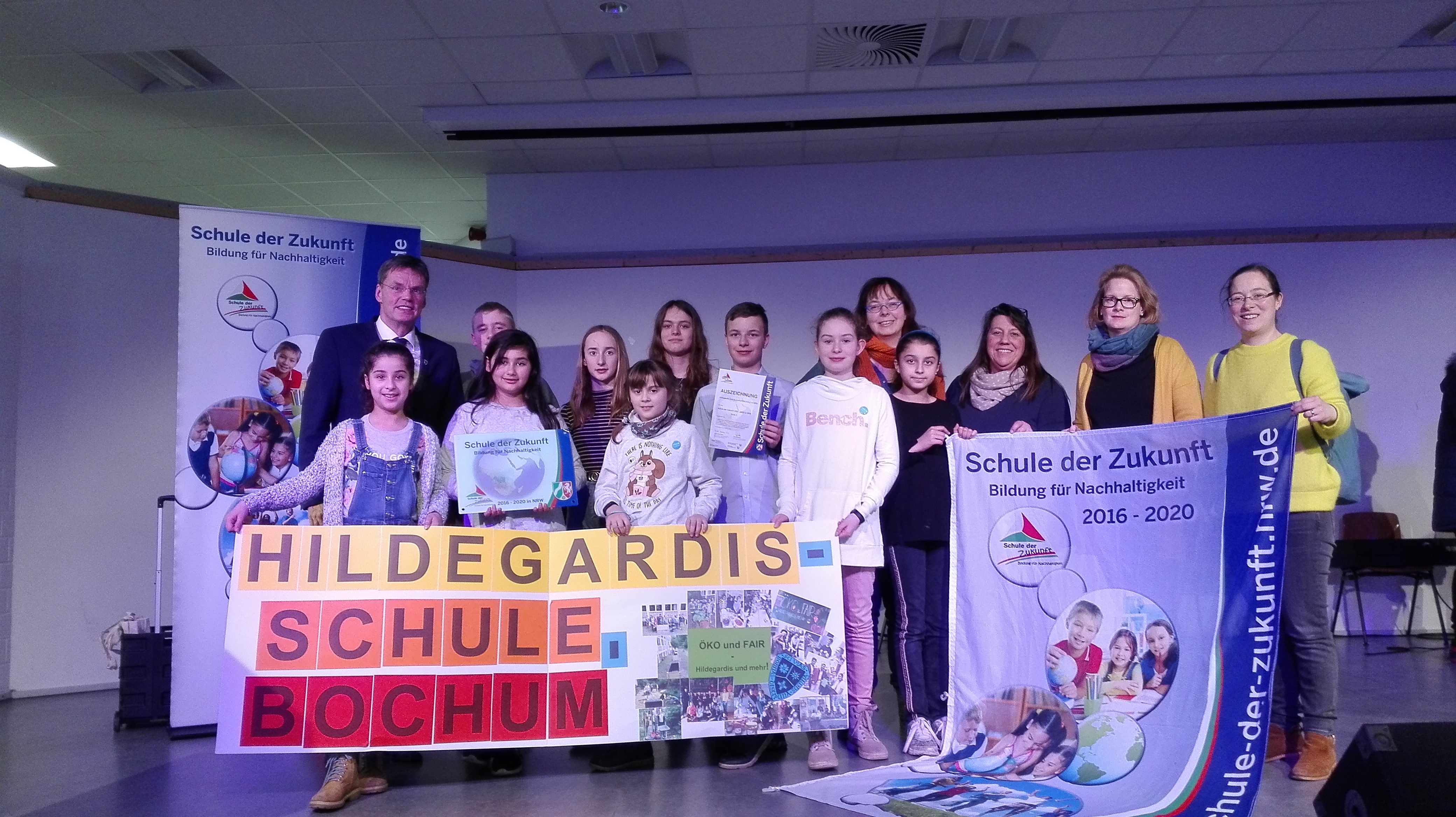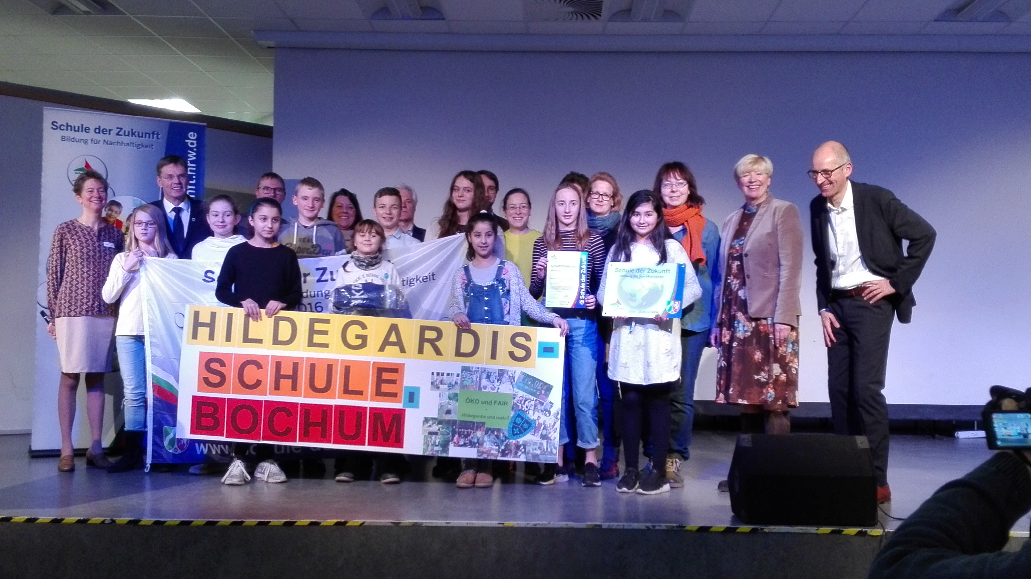 Stellvertretend für die gesamte Schulgemeinde waren heute zehn Schülerinnen und Schüler der Jahrgangsstufen 5, 6 und 8, von Lehrerseite Frau Köhn, Frau Solfrian-Brinkbäumer, Frau Faust und unser Schulleiter Herr Backhaus sowie unsere Elternvertreterin Frau Jäger an dem Heinrich-von-Kleist-Gymnasium in Bochum um die Auszeichnung zur Schule der Zukunft entgegen zu nehmen. Insgesamt war es ein sehr gelungener Vormittag, an dem wir zusätzlich zur Auszeichnungsfeier noch die Gelegenheit bekommen haben beim Markt der Möglichkeiten unser Projekt „ÖKO und FAIR – Hildegardis und mehr“ vorzustellen.