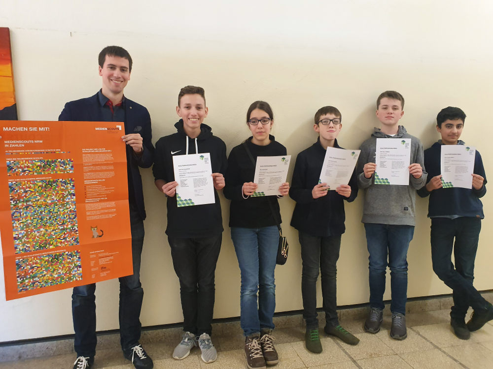 Die neuen Medienscouts wurden von der Landestanstalt für Medien zertifiziert. Nachdem die Ausbildung nun abgeschlossen ist, können die neuen Scouts spannende Projekte angehen. Am Ende des Halbjahres steht wieder der WhatsApp-Workshop für die 5. Klassen auf dem Programm. Aktuell lernen die Scouts die Grundlagen der Webprogrammierung mit HTML und CSS. Bei Fragen und Problemen rund um das Thema Medien könnt ihr uns eine