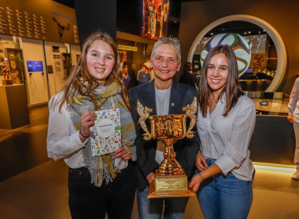 Danach konnte Pauline noch das Projekt vorstellen und einige Fragen dazu beantworten, bevor sie gemeinsam mit Sarah P., einer anderen Preisträgerin aus Bergisch-Gladbach einige Fotos mit den glücklichen WM-Siegerinnen mitsamt dem originalen Pokal machen konnte, den das Team damals gewonnen hatte. Auf dem Foto seht ihr Pauline und Sarah gemeinsam mit Petra Landers, einer Bochumer Fußball-Legende, die damals mit nur 19 Jahren den WM-Pokal gewann und die das Kinderbuch "Freistoß für Kathi" inspiriert und auch unterstützt hat.