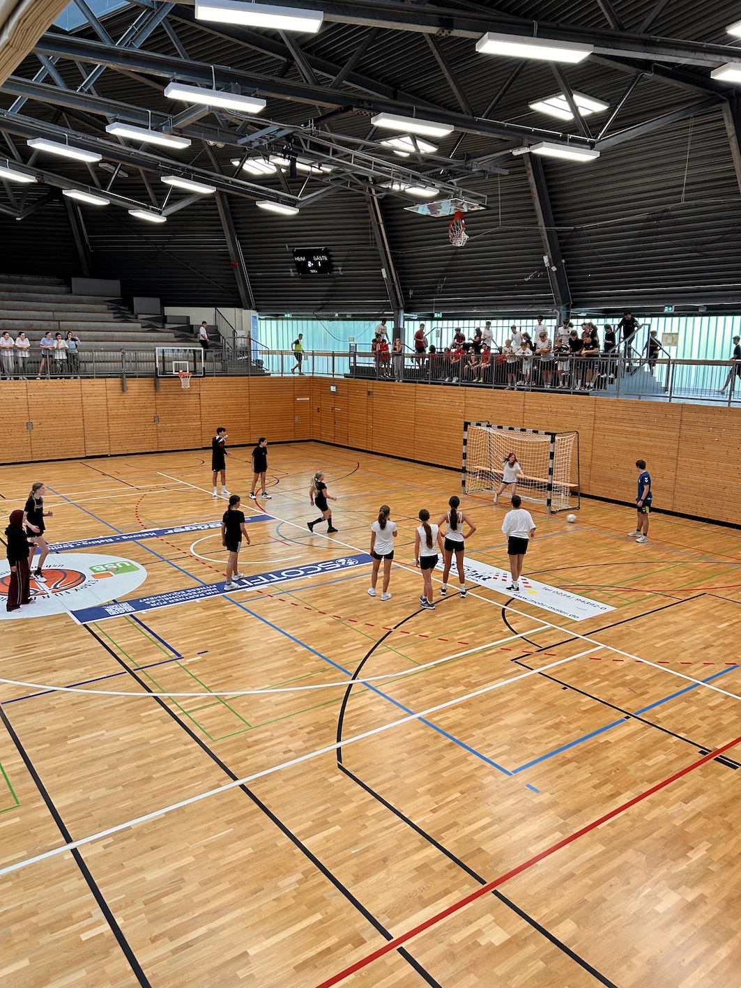 Das Hochspringen gewann die 8b, während sich beim Stoßen die 8c und beim Laufen die 8a durchsetze. Mit Spannung wurde dann den abschließenden Finalspielen entgegengefiebert. Nach den Spielen um Platz 3 und 4 trafen im Finale folgende Teams aufeinander: Beim Völkerball gewann die Klasse 8a äußerst knapp gegen die 8d, beim Mädchenfußball setzte sich die 8a gegen die 8d durch und beim Fußball der Jungen gewann die 8b überraschend gegen die 8c.