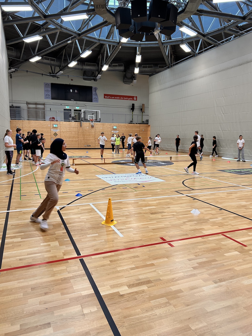 Nach der Begrüßung durch Herrn Breuing ging es mit einem gemeinsamen Aufwärmprogramm los, angeleitet durch die Sporthelfer der Q1.