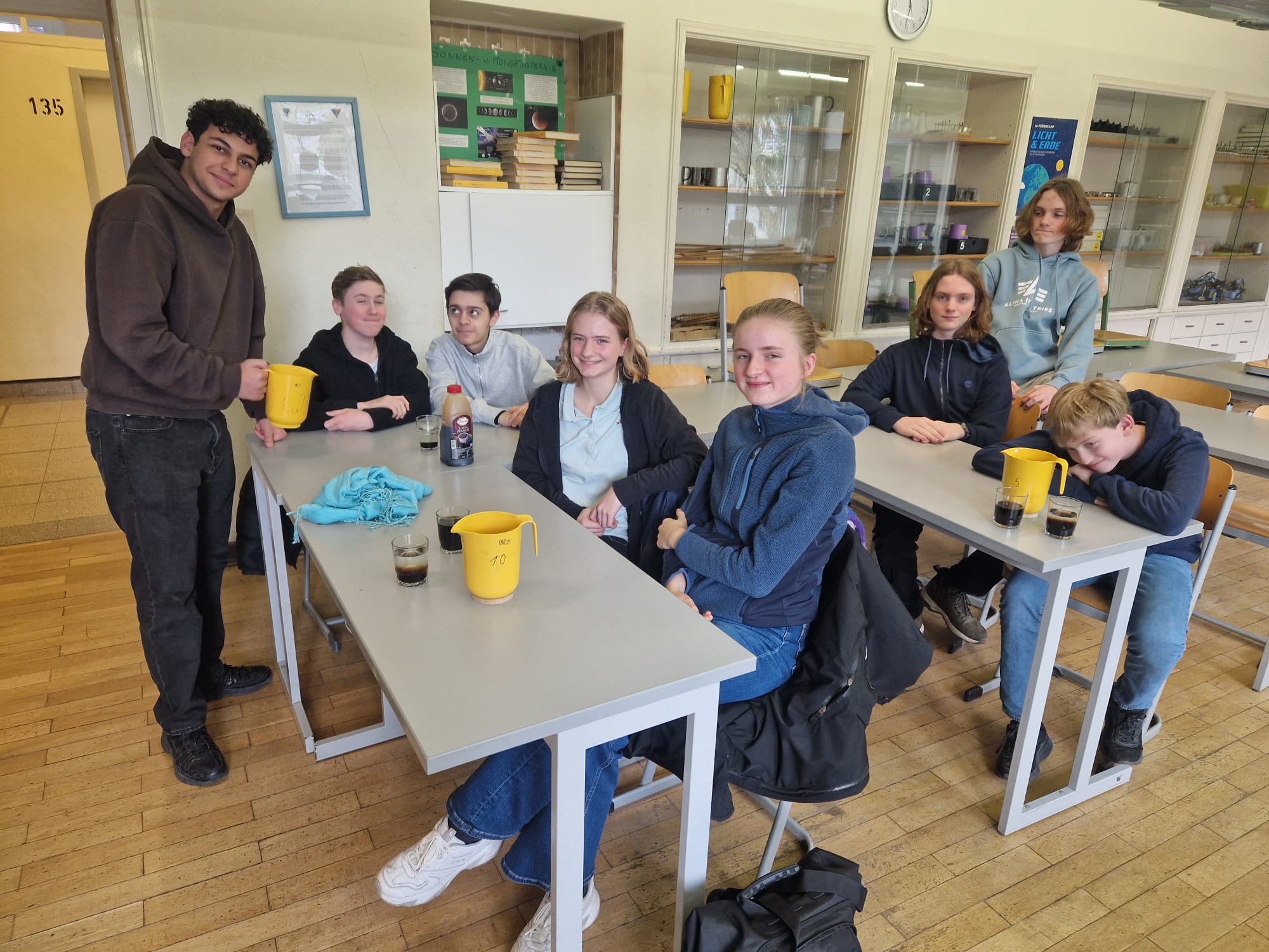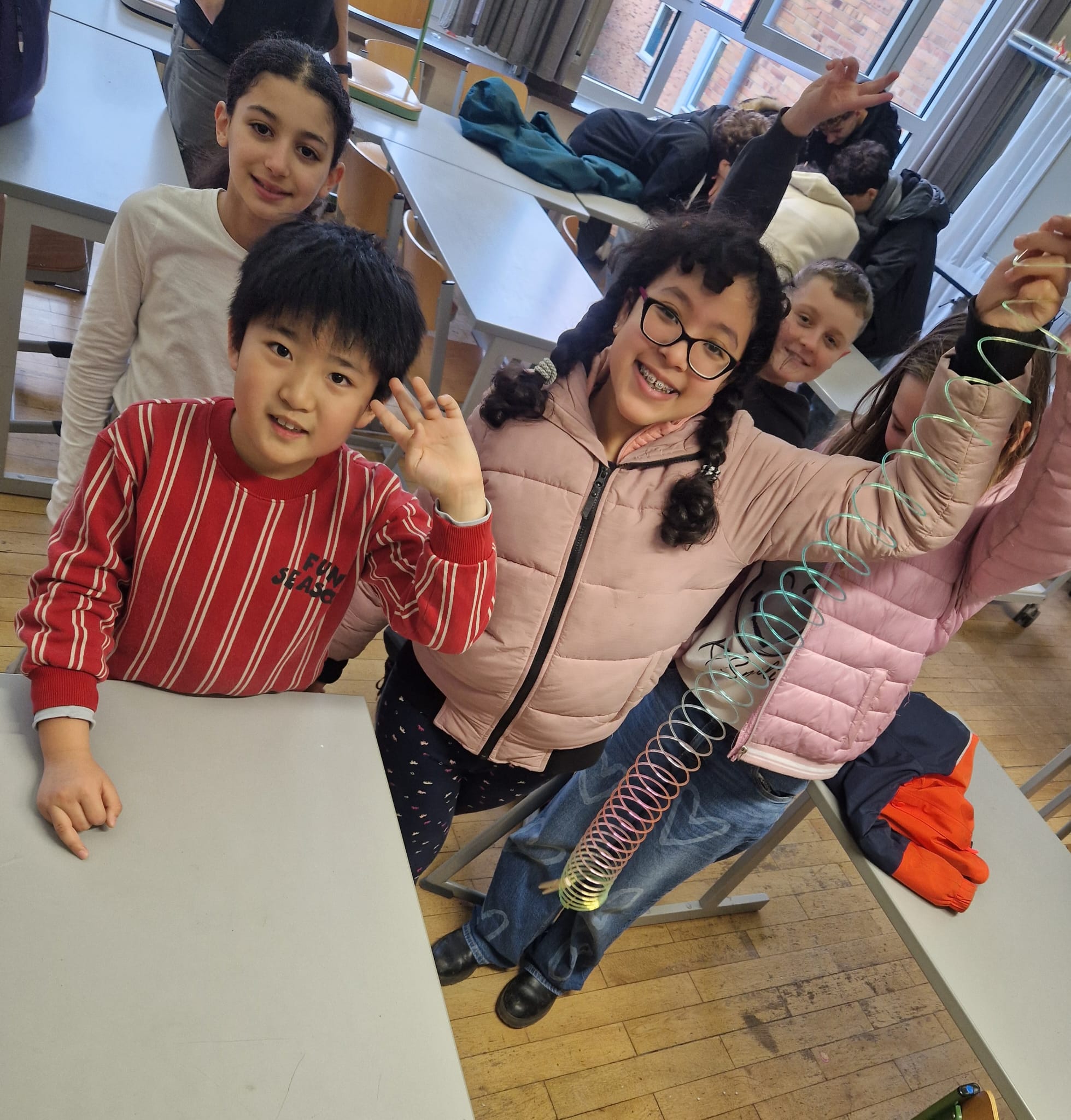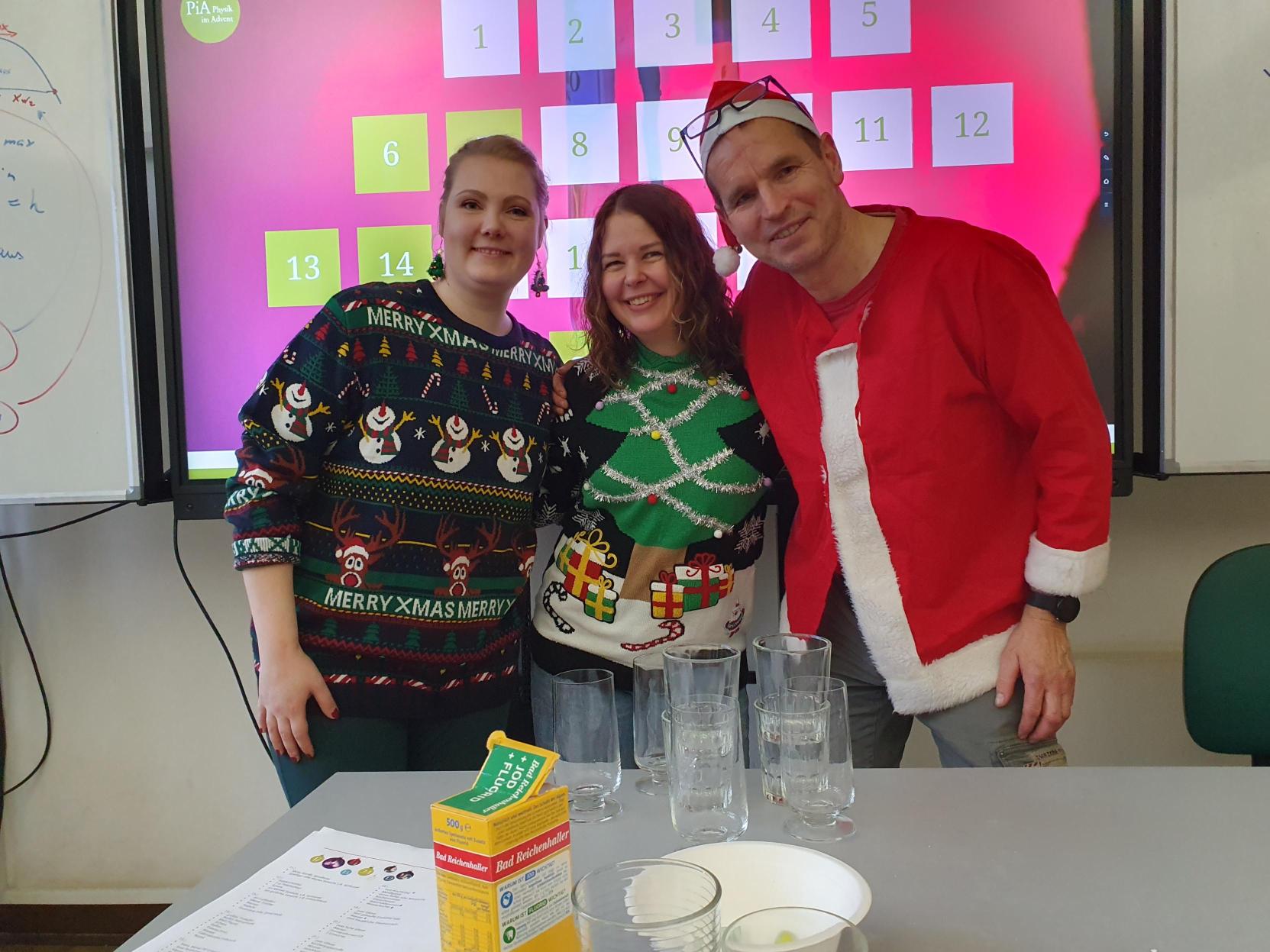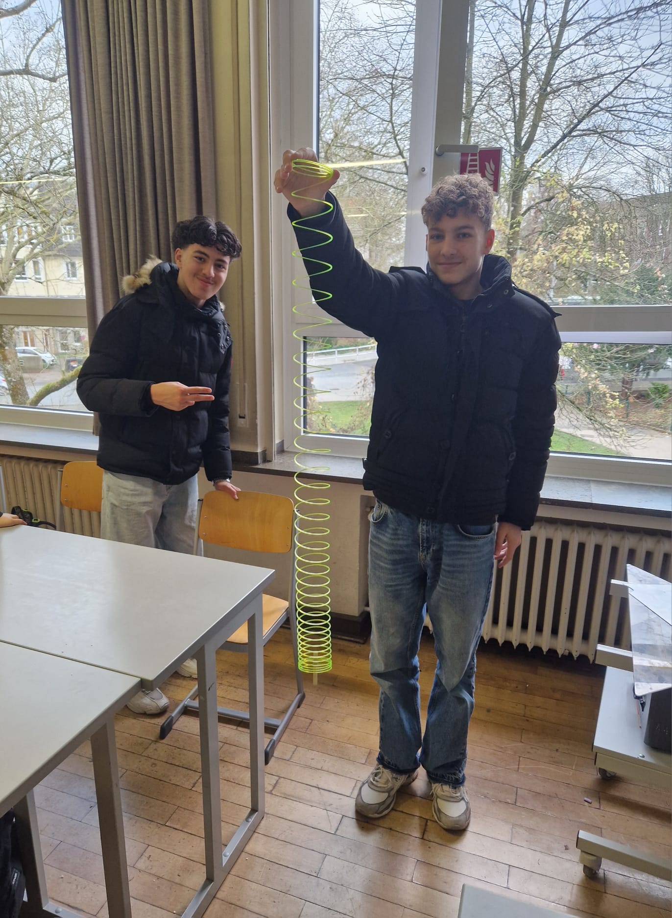 „Physik im Advent“ ist ein interaktiver Online-Adventskalender, bei dem jeden Tag per Video ein spannendes Experiment vorgestellt wird. Die gezeigten Experimente können selbst durchgeführt werden und anschließend gilt es, eine Frage zu dem Gesehenen zu beantworten. Dank der engagierten Unterstützung zahlreicher Oberstufenschüler*innen konnte „Physik im Advent“ in diesem Jahr am Hildegardis-Gymnasium auch "live" umgesetzt werden. In jeder zweiten Pause trafen sich interessierte Schüler*innen aller Jahrgangsstufen, um gemeinsam mit den Oberstufenschüler*innen und Physiklehrer*innen das Tagesvideo anzuschauen und das Experiment direkt vor Ort nachzumachen. Mit viel Neugier, Begeisterung und Staunen wurden zum Beispiel Luftballons mit einem Fön fliegen gelassen, Weihnachtskugeln geschwungen oder Papierstreifen mit Wasser "weggezaubert".
